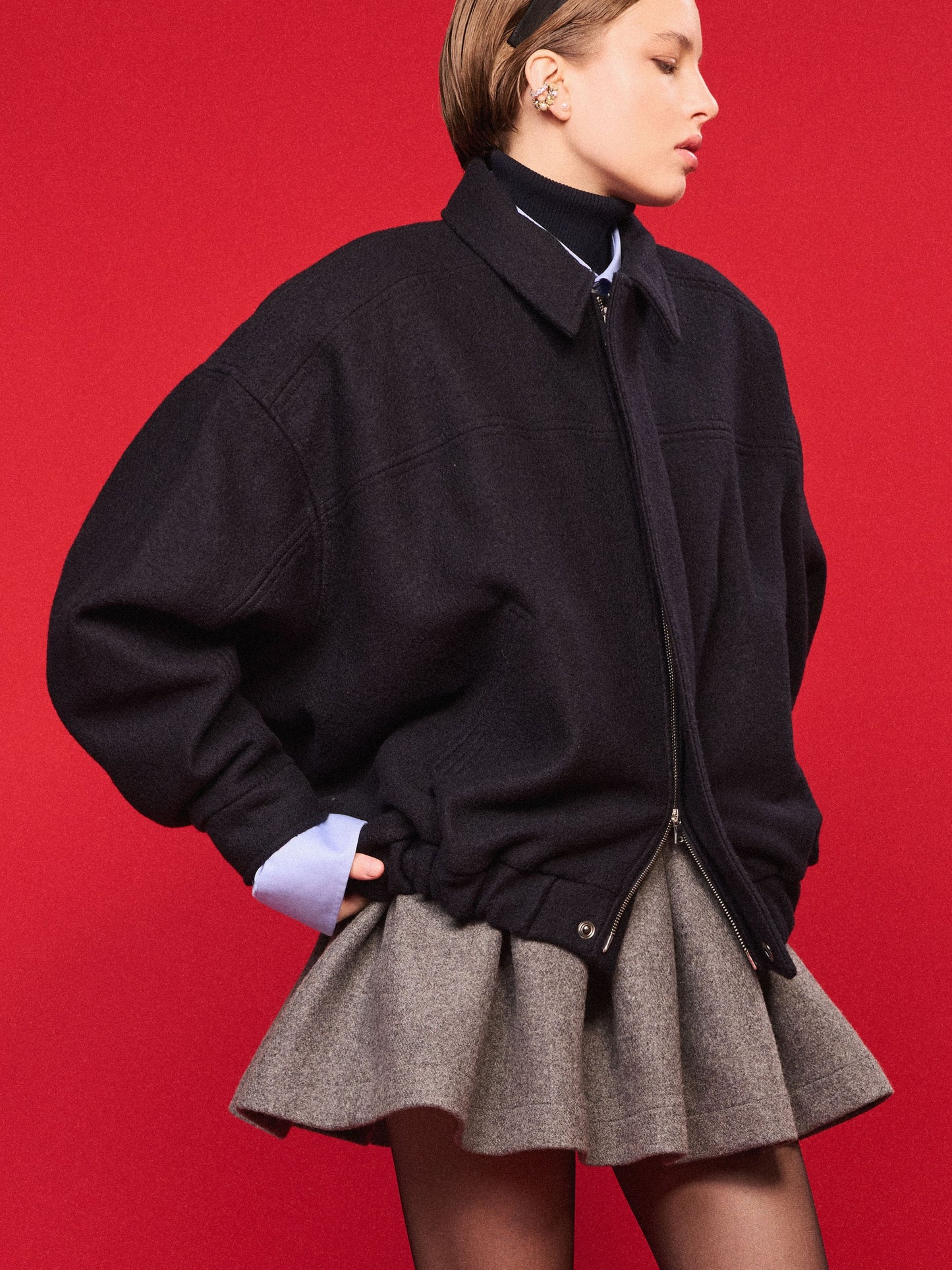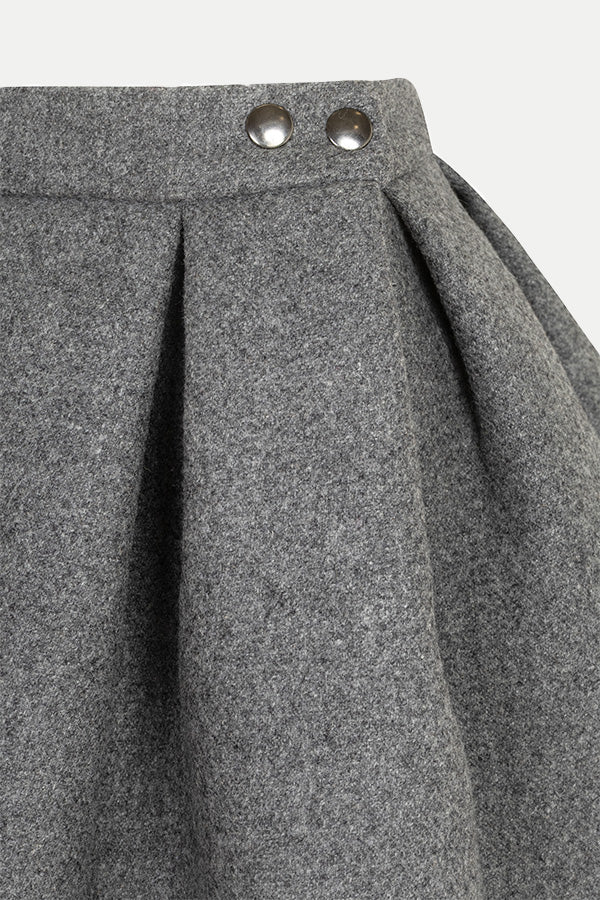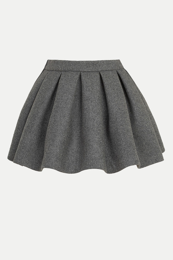 A structured wool mini skirt with a voluminous silhouette, defined by crisp pleats and a classic gray hue. Designed to create movement, shape and a confident, sculpted profile.