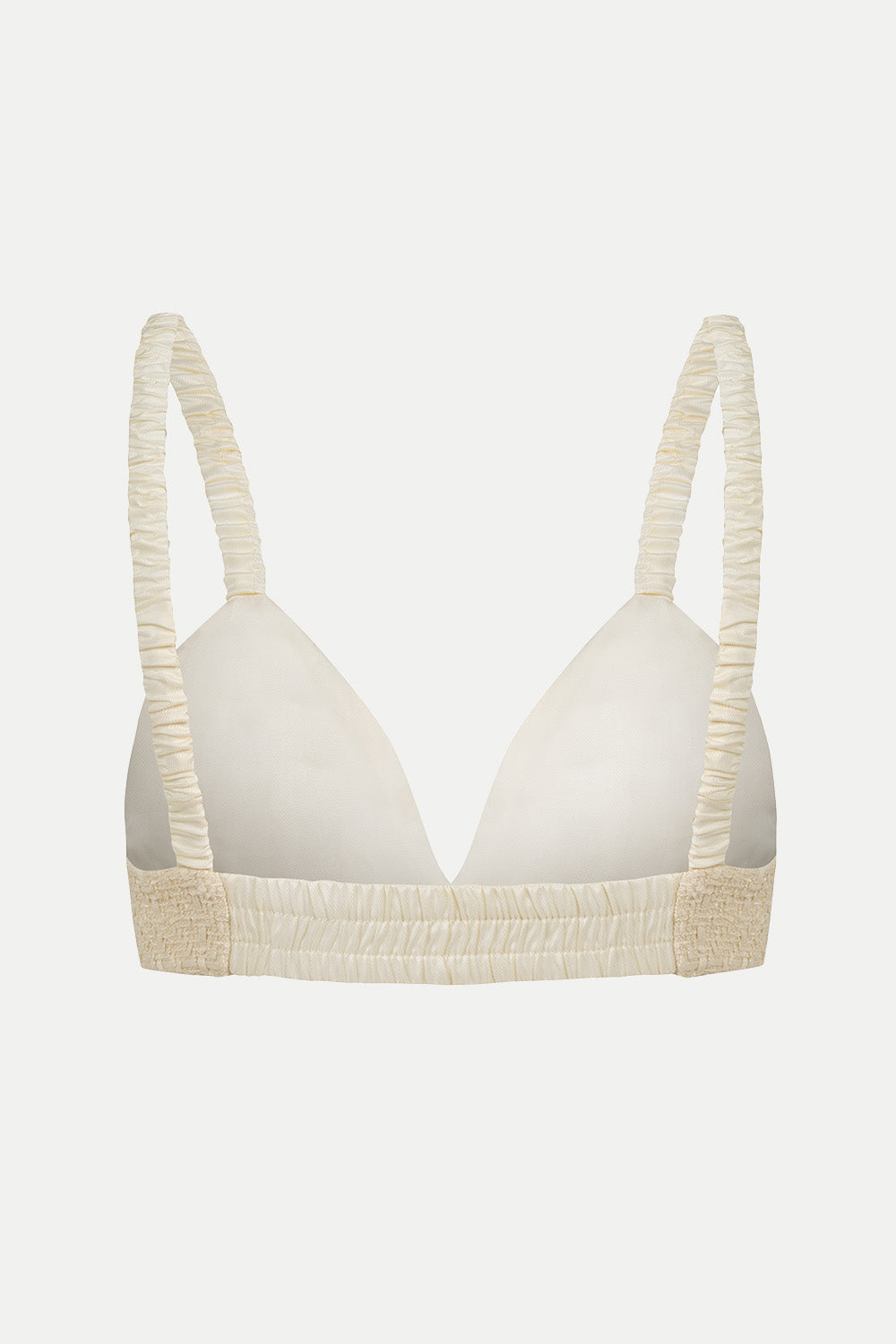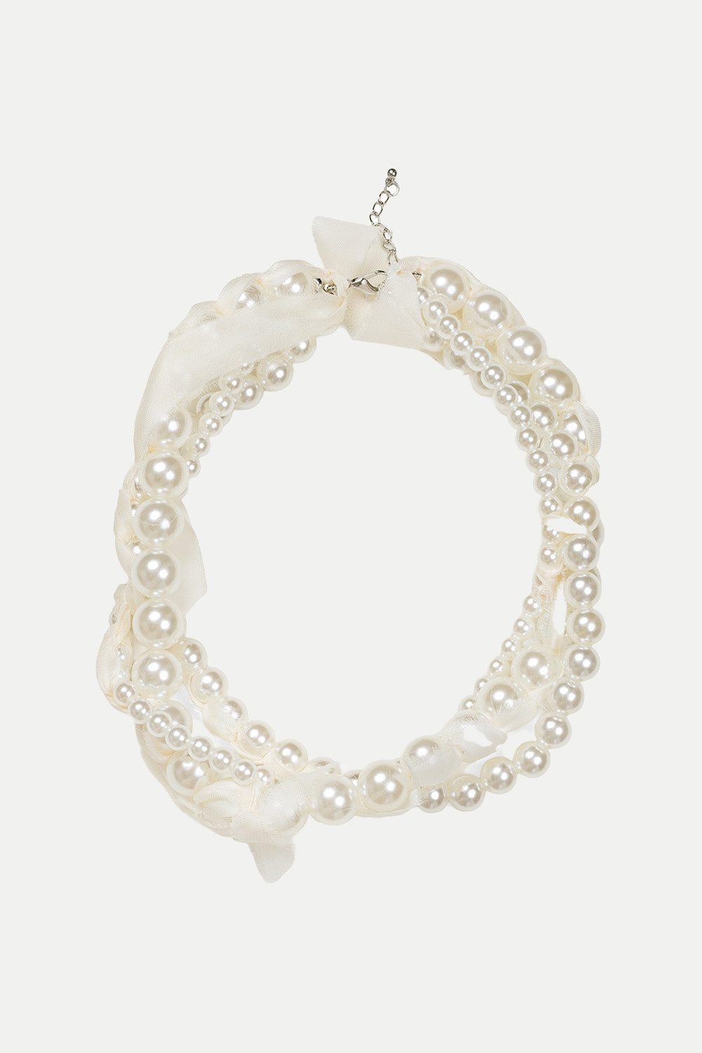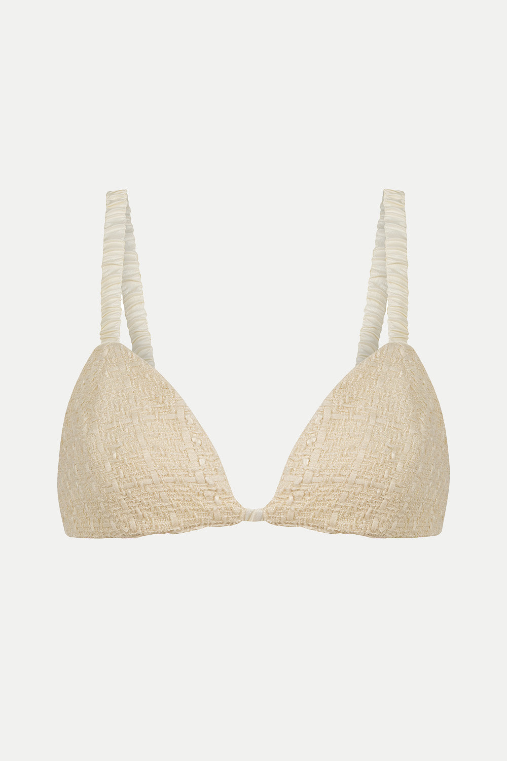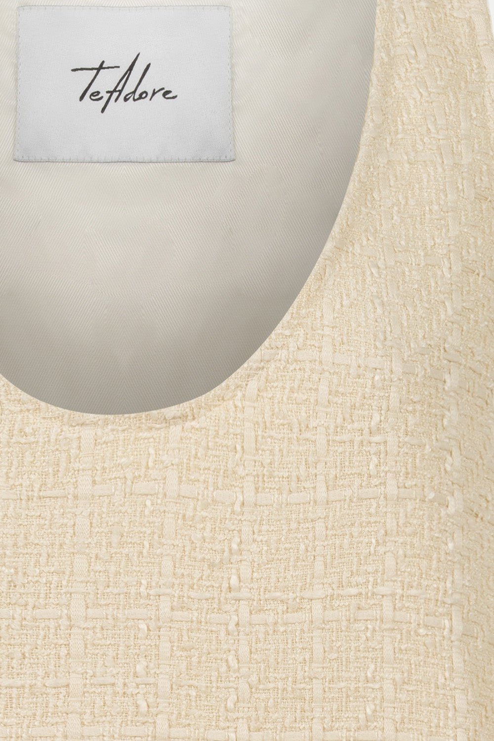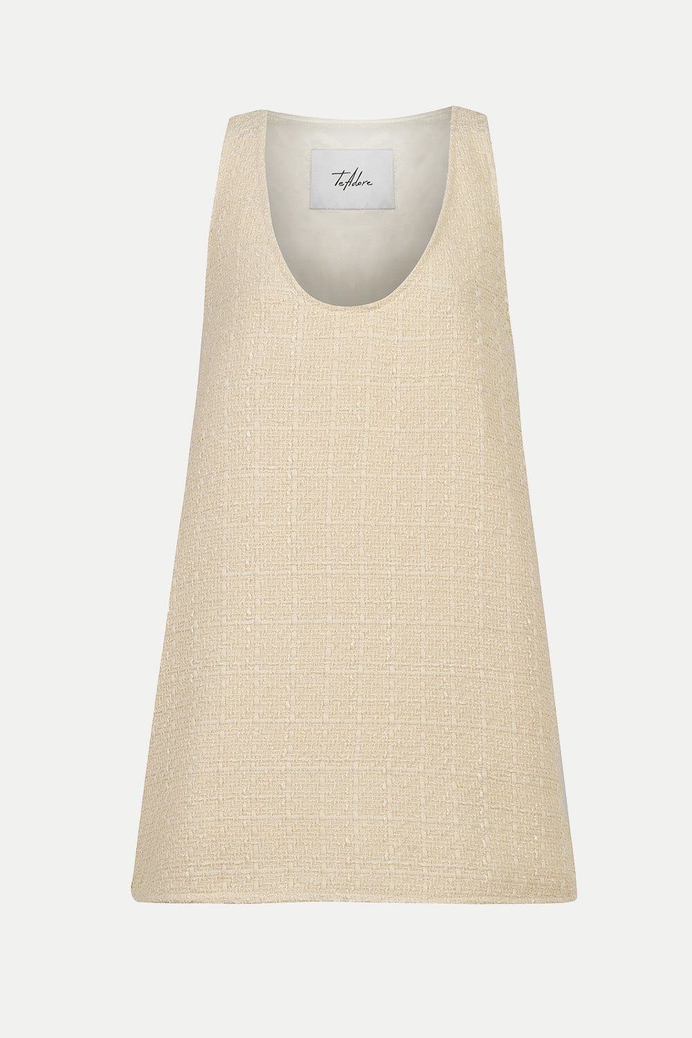 Mini sleeveless dress, crafted from a statement creamy boucle fabric with a chic oversized fit, a matching peaking bralette and a feminine shift design.With pearl necklace.