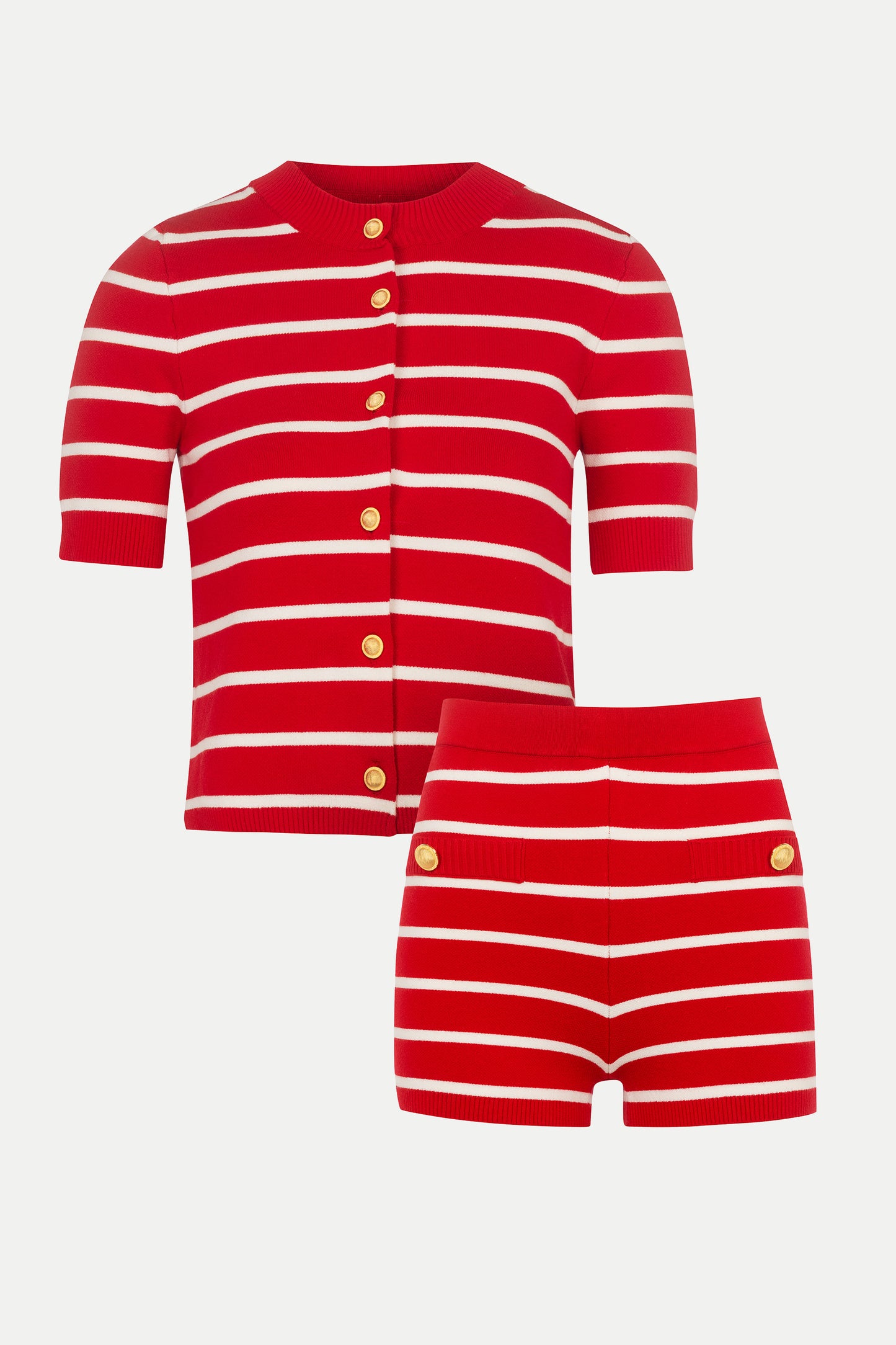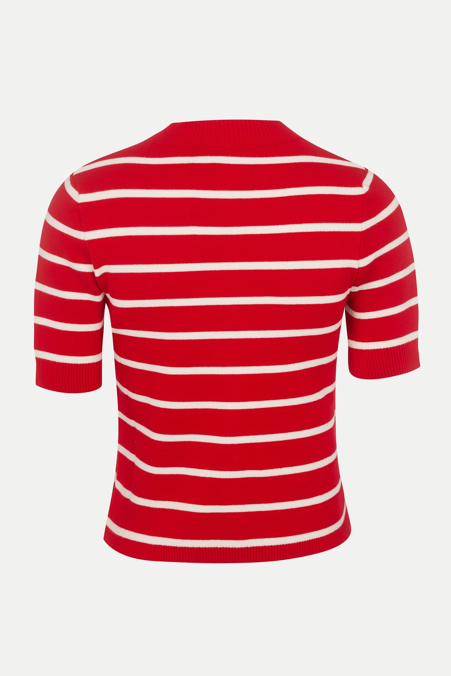 Short sleeve cardigan from fine knit in red and white stripes. For a refined look, combine with the matching Isla Red Fine-knit Shorts