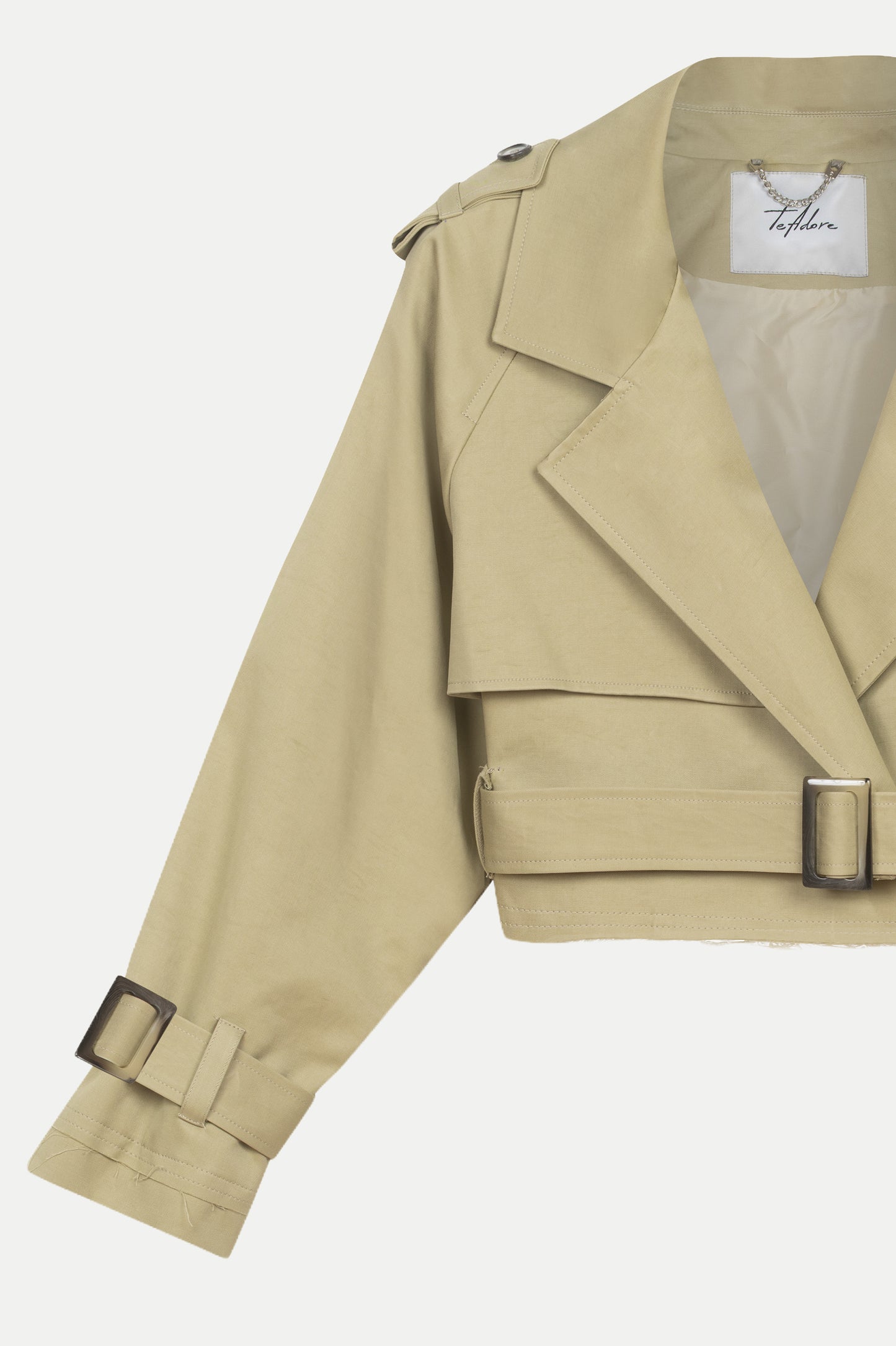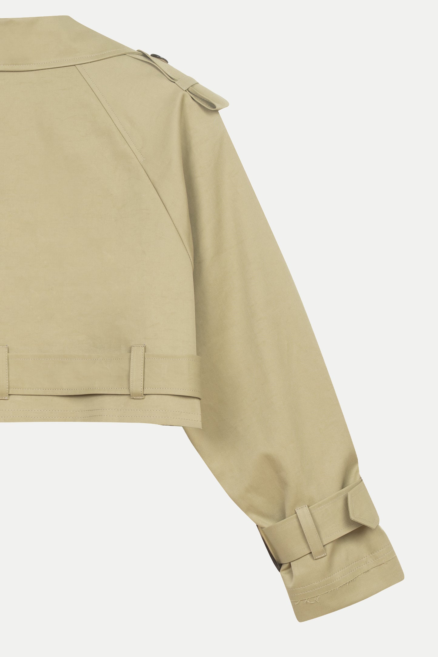 Crafted from cotton gabardine in sand beige hue, this coat is a contemporary and chic take on classic trench styles
