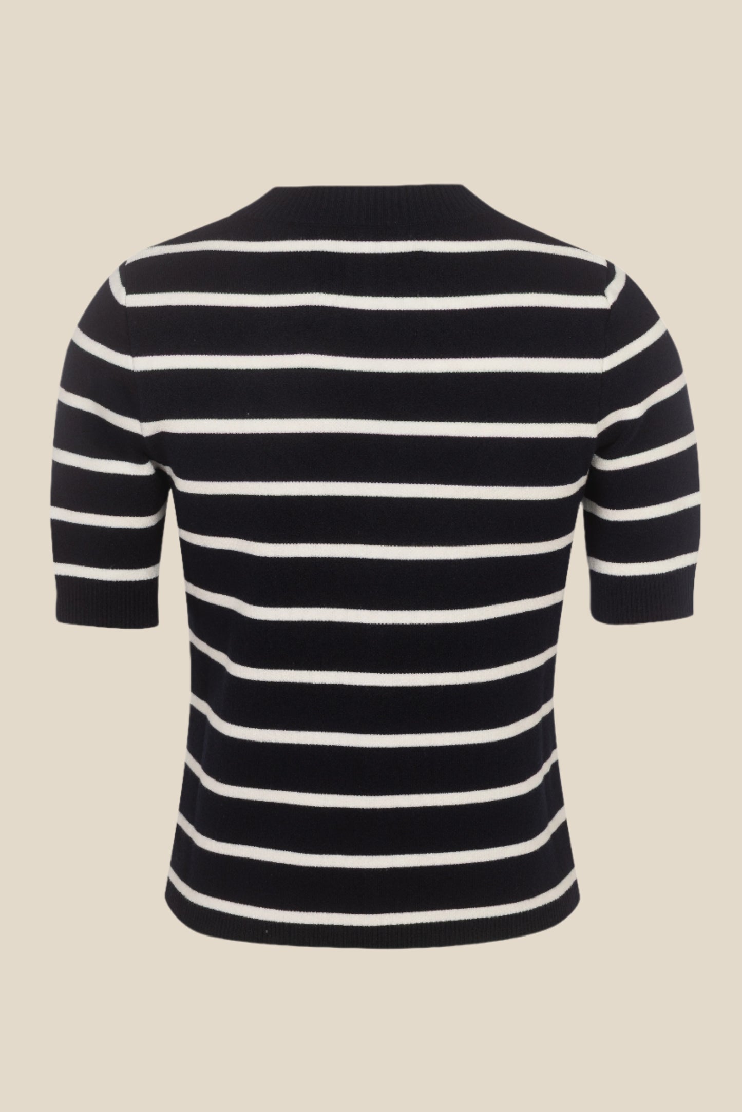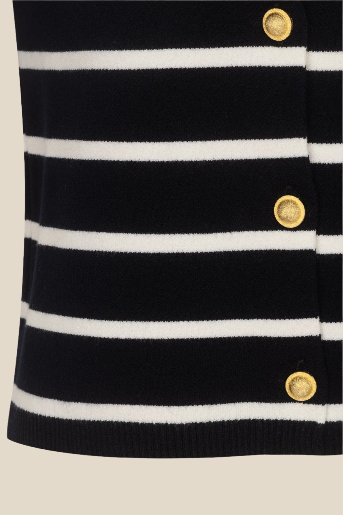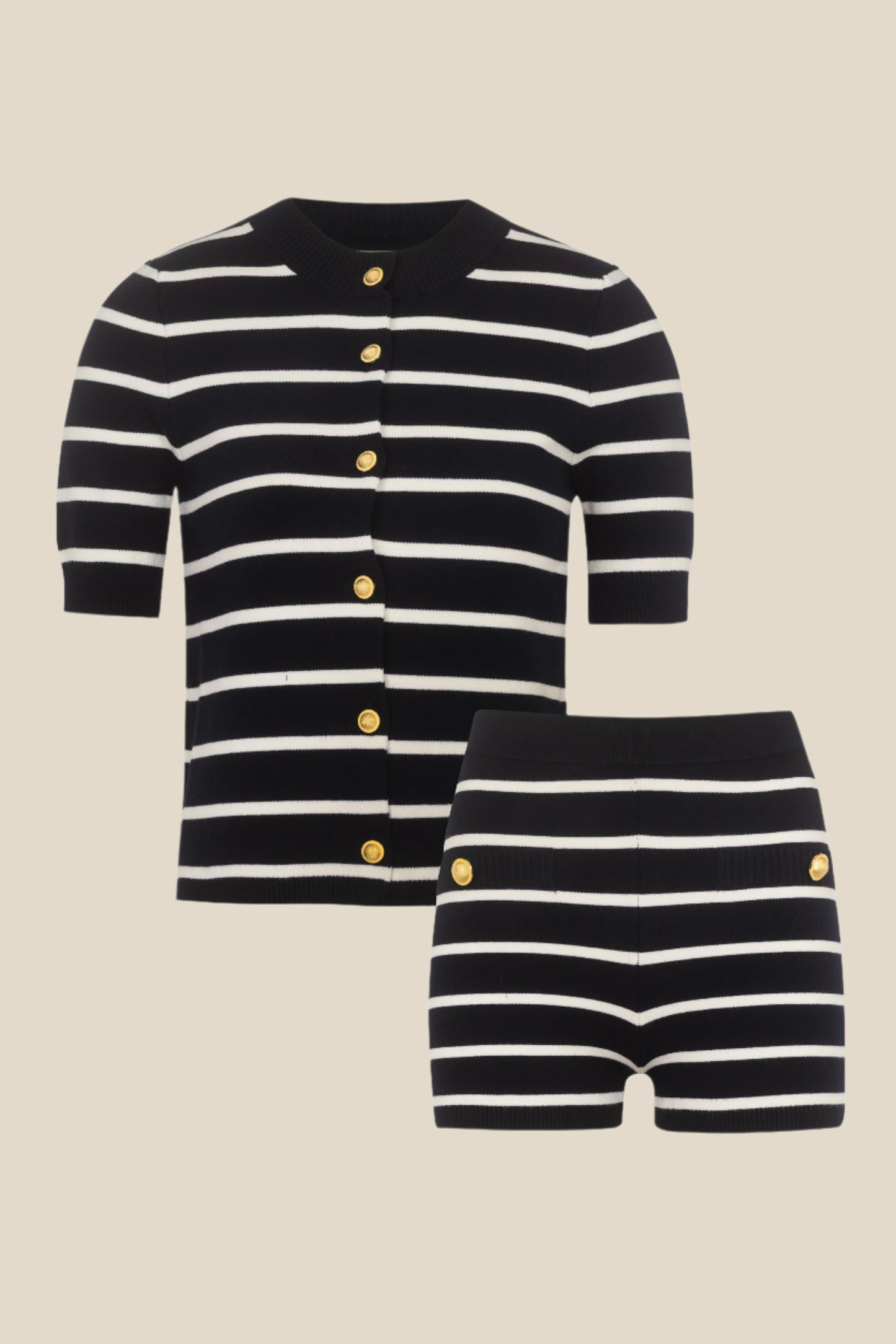 Short sleeve cardigan from fine knit in navy and white stripes. For a refined look, combine with the matching Isla Navy Fine-Knit Shorts