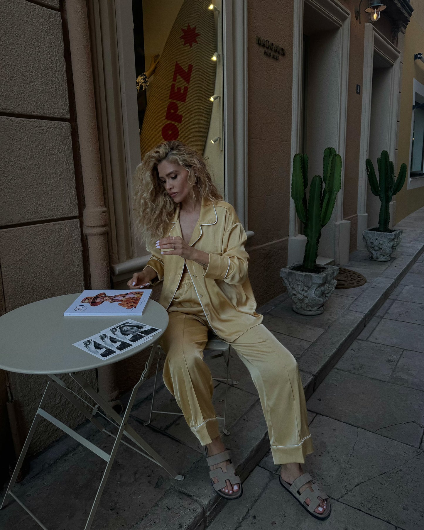 Pyjama set crafted from smooth satin in golden shade.