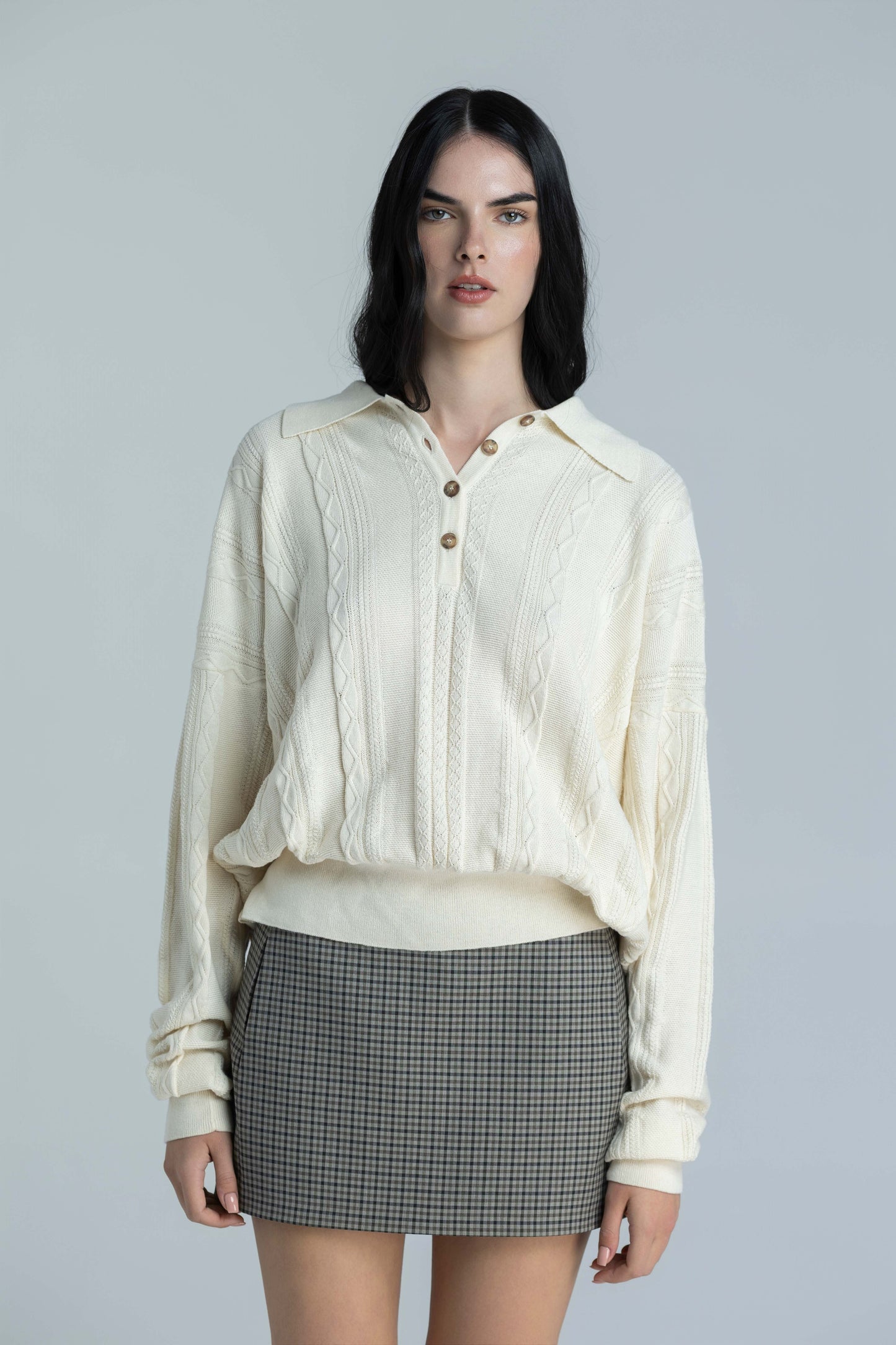 Crafted from wool and cashmere in a fine check pattern in neutral tones, this mini skirt features a mid-rise cut with a clean, structured silhouette that flatters effortlessly. Perfect for pairing with the Kaia Cotton Knit Top and the Almira Trench Coat.